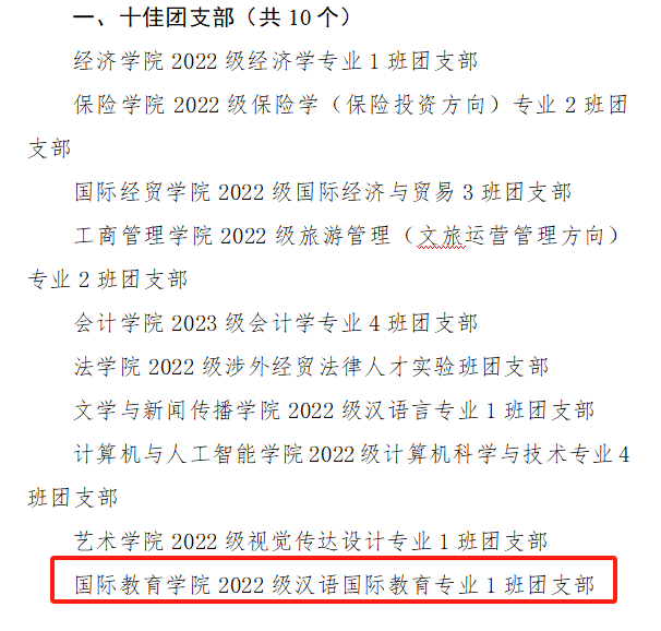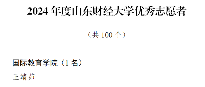 在此次表彰大会上,国际教育学院师生展现出蓬勃向上的精神风貌与卓越成就,以实际行动诠释当代“五四精神”,获得多项集体与个人荣誉。我院团委荣获2024年度山东财经大学共青团工作创新奖团委、十佳团支部1个、优秀共青团干部8名、优秀共青团员14名、十佳志愿服务工作者1名与优秀志愿者1名。