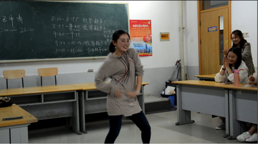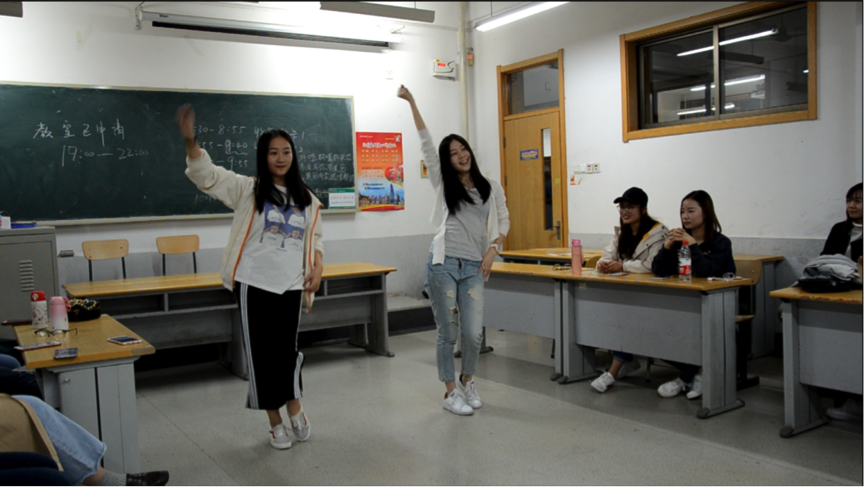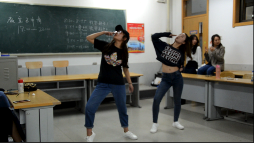 为了给大家最后评分的缓解压力,舞社副社长李奕童和友情赞助的青年志愿者协会副社长刘晓溪为舞社成员带来了诙谐幽默的网络舞蹈——海草舞和捣蒜舞,最近一段时间我们无论是在微信、微博还是各种网络互动平台上总是能够轻易的听到或者看到《海草舞》的相关的视频,虽然动作难度不高,但这无疑为斗舞紧张的气氛带来了欢声笑语。