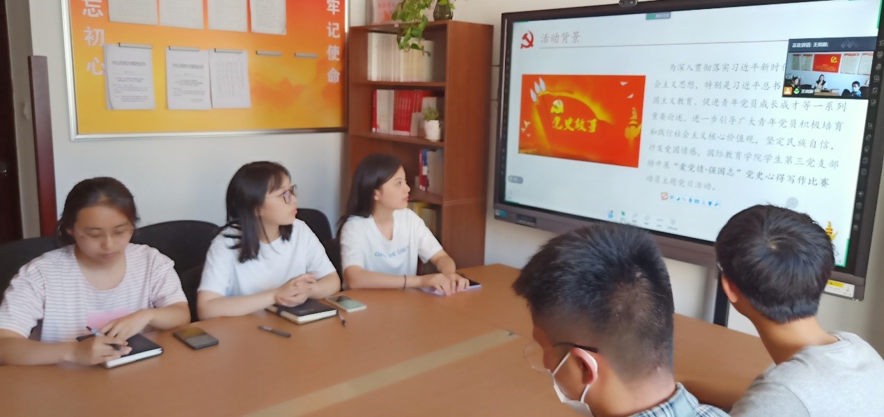 为深入贯彻落实习近平新时代中国特色社会主义思想,特别是习近平总书记关于加强爱国主义教育、促进青年党员成长成才等一系列重要论述,进一步引导广大青年党员积极培育和践行社会主义核心价值观,坚定民族自信,抒发爱国情感,5月28日,国教学生第三党支部于干训楼9402开展“爱党情·强国志”党史心得写作比赛动员主题党日活动,活动采取线上线下结合的形式,由支部副书记王奕澎主持,全体党员参加。