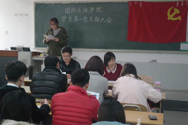 2015年12月24日中午,国际交流学院(国际商学院)学生第一党支部在舜耕校区1107教室召开了支部大会,会议主题是吸收预备党员及预备党员转正,支部全体学生党员和本期发展对象参加。大会严格按照接受预备党员和预备党员转正的支部大会程序进行,最后经全体正式党员无记名投票表决,一致同意接收本期8名发展对象成为中共预备党员,并吸收3名预备党员按期转为中共正式党员。